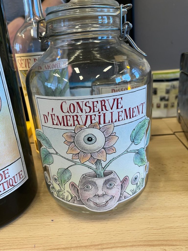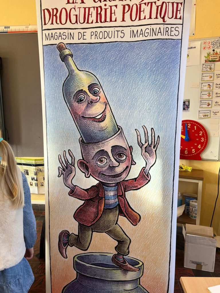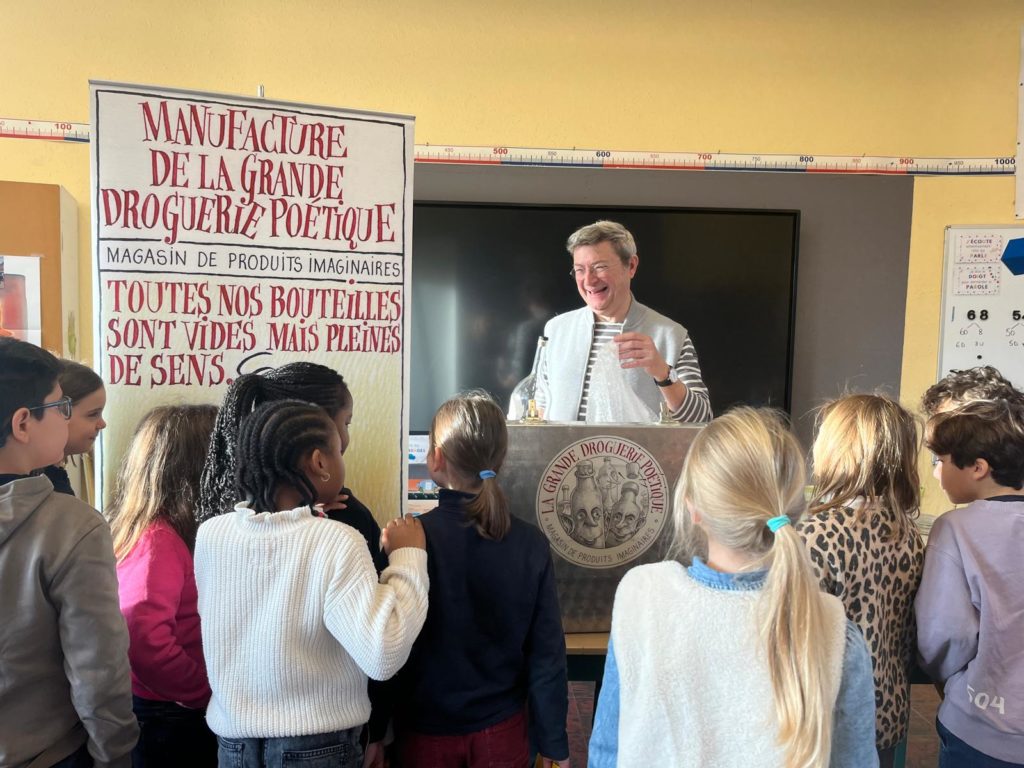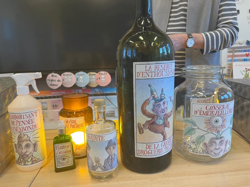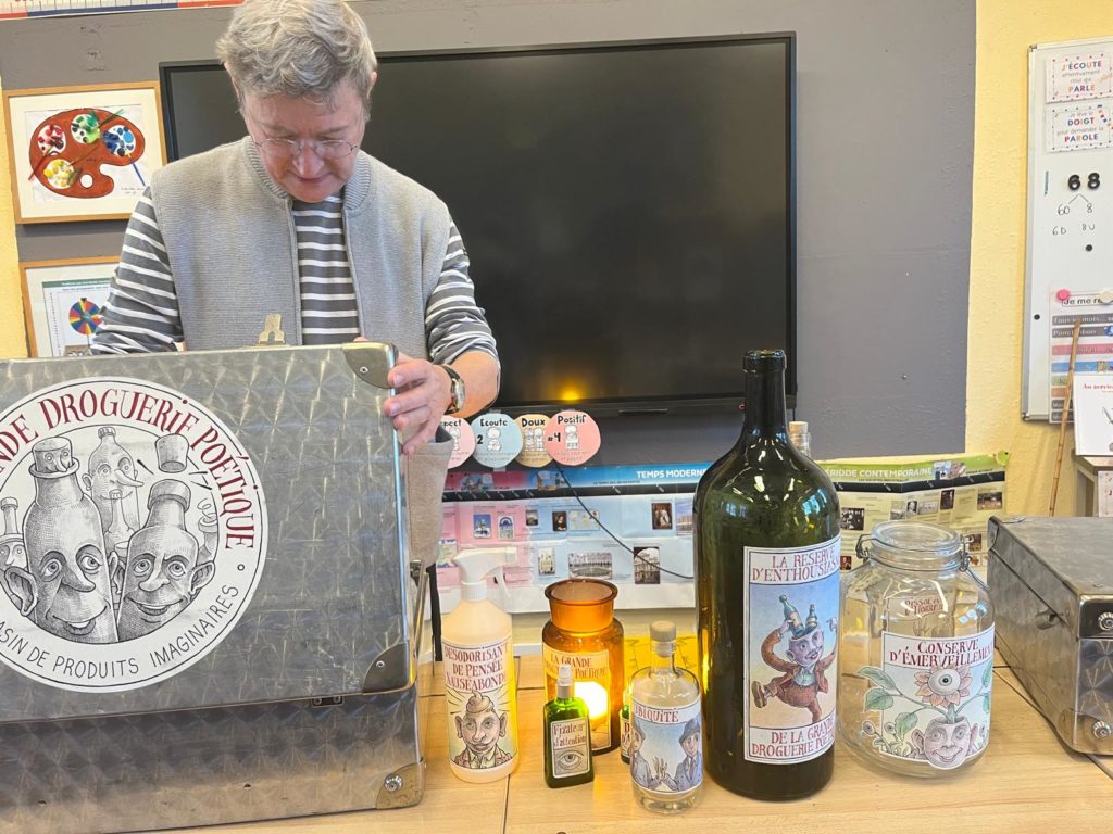 Quand la grande droguerie poétique s’invite dans nos classes…. Un magasin de produits imaginaires : des bouteilles, des flacons, des bocaux… remplis d’émerveillement, d’enthousiasme, d’amour,… Merci Monsieur Maes pour ce délicieux moment ! (P3-P4)